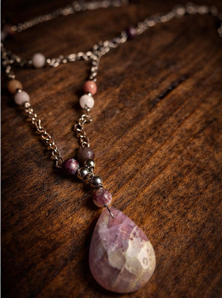 Collar VISHNU de acero inoxidable, colgante de Kunzita, y cuentas de cuarzo blanco, cuarzo rosa, rodonita, piedra luna y turmalina flor.